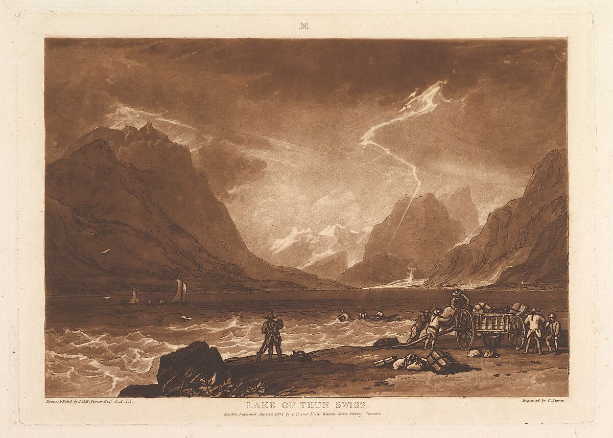 Turner distilled his ideas about landscape In "Liber Studiorum" (Latin for Book of Studies), a series of seventy prints plus a frontispiece published between 1807 and 1819. To establish the compositions, he made brown watercolor drawings, then etched outlines onto copper plates. Professional engravers usually developed the tone under Turner's direction, and Charles Turner here added mezzotint to describe a Swiss mountain lake agitated by an approaching storm, with a distant lightning strike causing figures in the foreground to hurry for cover. Mezzotint's capacity to convey the bright flash of light and its reflections on the water is used to great effect and the "M" in the upper margin indicates Turner's category of Marine landscape.