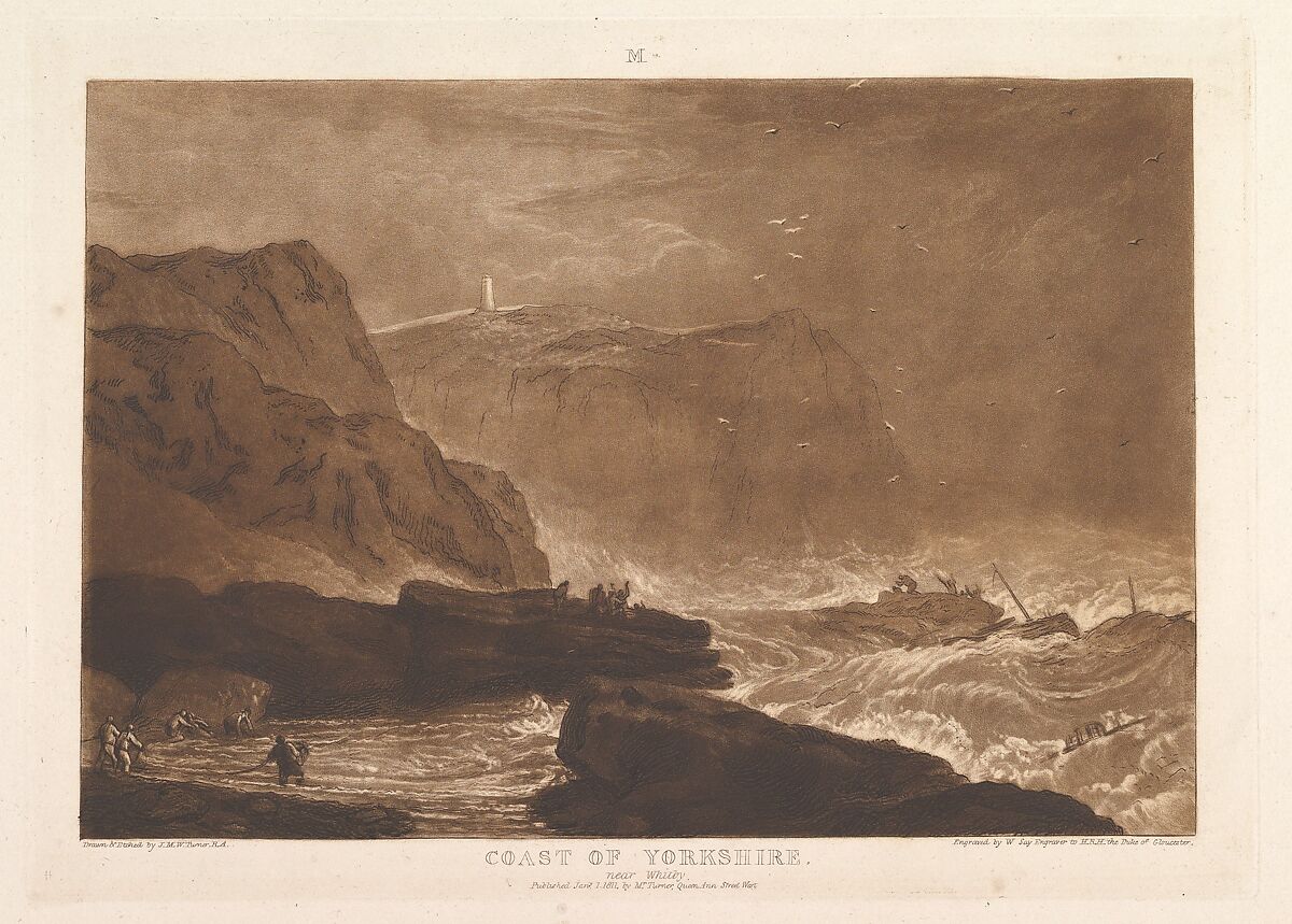 Turner distilled his ideas about landscape In "Liber Studiorum" (Latin for Book of Studies), a series of seventy prints plus a frontispiece published between 1807 and 1819. To establish the compositions, he made brown watercolor drawings, then etched outlines onto copper plates. Professional engravers usually developed the tone under Turner's direction, and Say here added mezzotint to define rough seas pounding a dark, rocky stretch of Yorkshire coast where stranded passengers from a wrecked ship appeal for help to figures on shore, and men wade into a sheltered foreground cove. A lighthouse punctuates the skyline and the letter "M" in the top margin indicates Turner's category of Marine landscape.