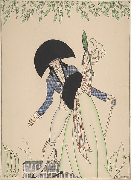 Theatrical costume designs for early 19th-century (?) French lieutenant and a lary. His costume is a full suit of the style of the 'incroyables', consisting of a blue cropped jacket, tight-fitting, white knee breeches, white stockings and black shoes, worn with a white scarf tied around the neck, black hat, cream gloves, and a cane, held on the left hand. Her dress consists of a checked blouse colored with red and green and a light green, full skirt, worn with a green hat with a rich bundle of large, scrolling, white feathers. The couple is depicted strolling outdoors, possibly in a garden and under a tree, with a palace facade in the background.