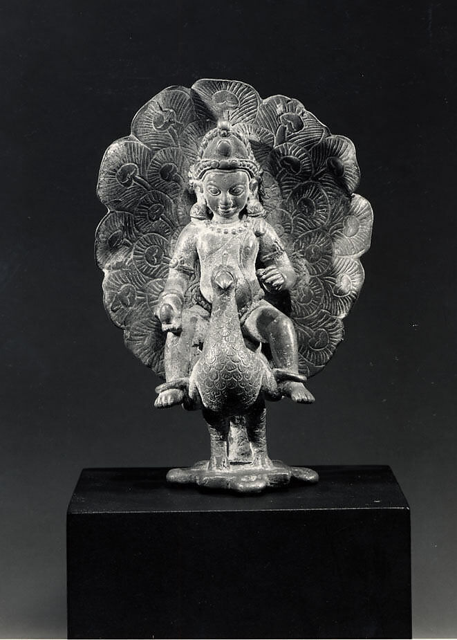 Kumara (“the everlasting youthful son”) is an epithet of Skanda, a son of Shiva and Parvati. He is also synonymous with Karttikeya, the god of war in the Hindu pantheon. Here he is riding the peacock Paravani, a creature renowned for its aggressiveness and speed in combat.