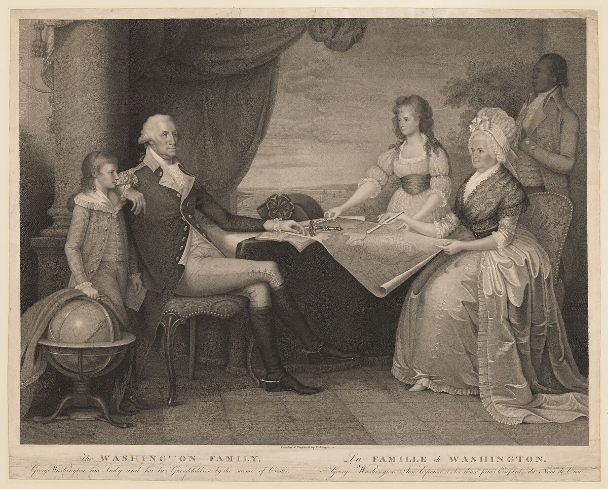 Savage based this engraving on his own painting of 1789-96 (now National Gallery, Washington). We are shown the nation's first president and his family gathered at Mount Vernon, their Virginia estate. Dressed in his Revolutionary War uniform, the former general rests one hand on a plan for the new capital city of Washington D.C., resting the other his step-grandson, George Washinton Parke Custis. At the right end of the table, Martha Washington sits near her granddaughter Eleanor Park Custis and a Black servant. The latter has traditionally been identified as William (Billy) Lee, the enslaved valet who attended Washington throughout the Revolutionary War, and then worked at Mount Vernon. Recent research suggests, however, that he may be Christopher Sheets, another enslaved servant. Following the death of their father, Martha's son from her first marriage, the Custis children were raised by their grandmother and step-grandfather. The Potomac River is glimpsed here in the distance, while titles in English and French below the image indicate an anticipated market for this print in France.