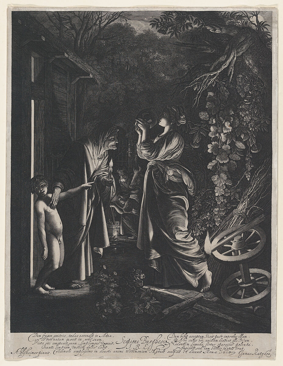 Made during Goudt’s residence in Rome from about 1604 to 1610, this engraving depicts the goddess Ceres on her quest to find her daughter, Proserpina. Quenching her thirst at a stranger’s home, she is mocked by a little boy for drinking so greedily. Areas of untouched paper contrast powerfully with the dense, richly inked lines. Especially striking is the sliver of light that gleams through the opening of the cottage door. The print bears a dedication to Cardinal Scipione Borghese, an important collector and patron in Rome.