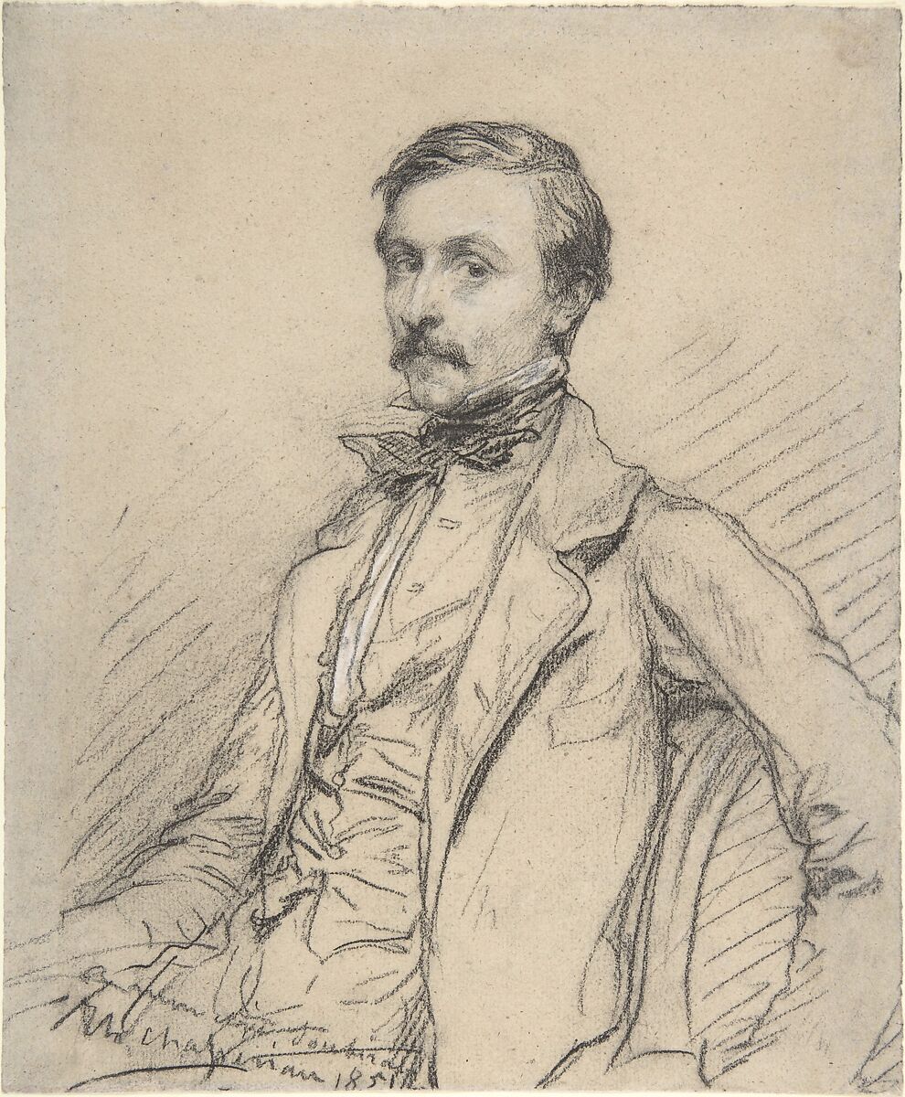 The sitter is thought to be the artist’s brother, Ernest, an infantry officer in the French navy, who died during the Franco-Prussian War (1870–71). Chassériau’s crayon seems to have virtually danced across the sheet, as it marked the contours and creases of Ernest’s jacket, waistcoat, and tie. The sitter’s penetrating gaze and refined features are treated with a tenderness befitting a beloved brother.