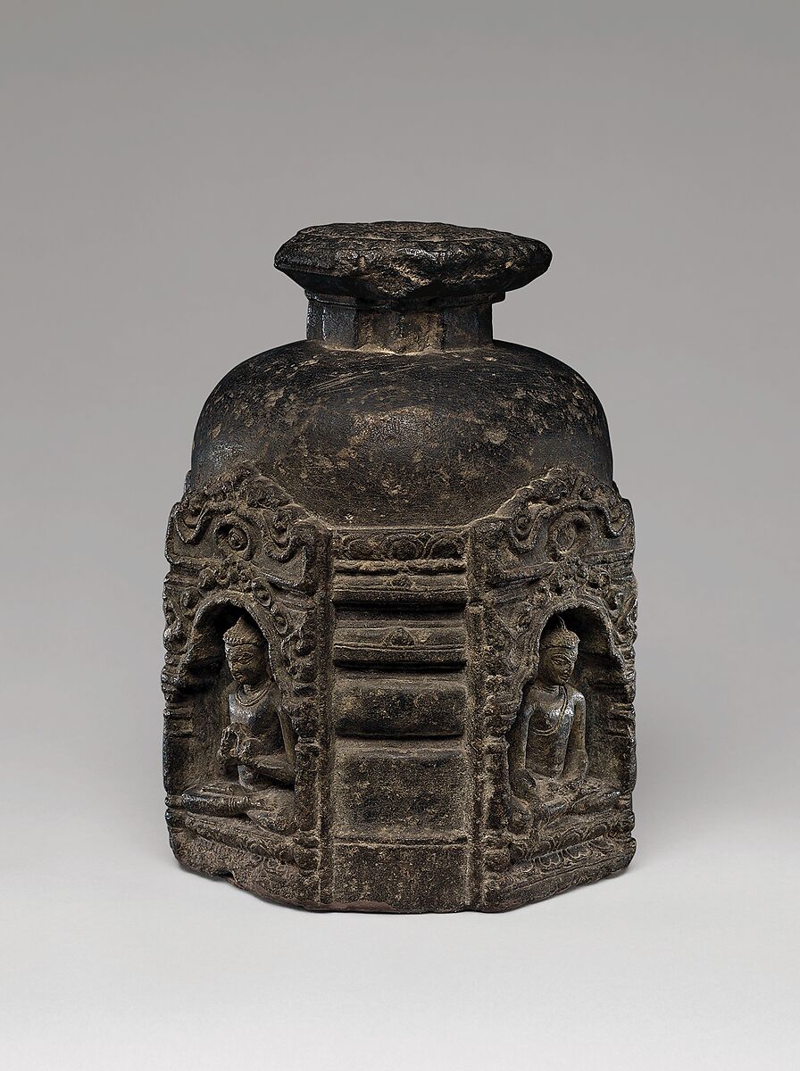 Small stupas such as this example were placed near massive stupas containing the ashes of the Buddha. By this time, the connection between the historic Buddha Shakyamuni, who revealed the Buddhist teachings on earth, and the Buddha Vairochana, who resides in heaven, was known from texts and accepted in religious practice. The dome of the stupa simultaneously represents Shakyamuni’s relics and Vairochana’s celestial presence. The four directional Buddhas look out of foliate niches. These small stupas held the ashes of the monastic dead, allowing deceased monks to be eternally in the presence of the Buddha Shakyamuni and perhaps even aided in their being reborn in one of the pure lands.