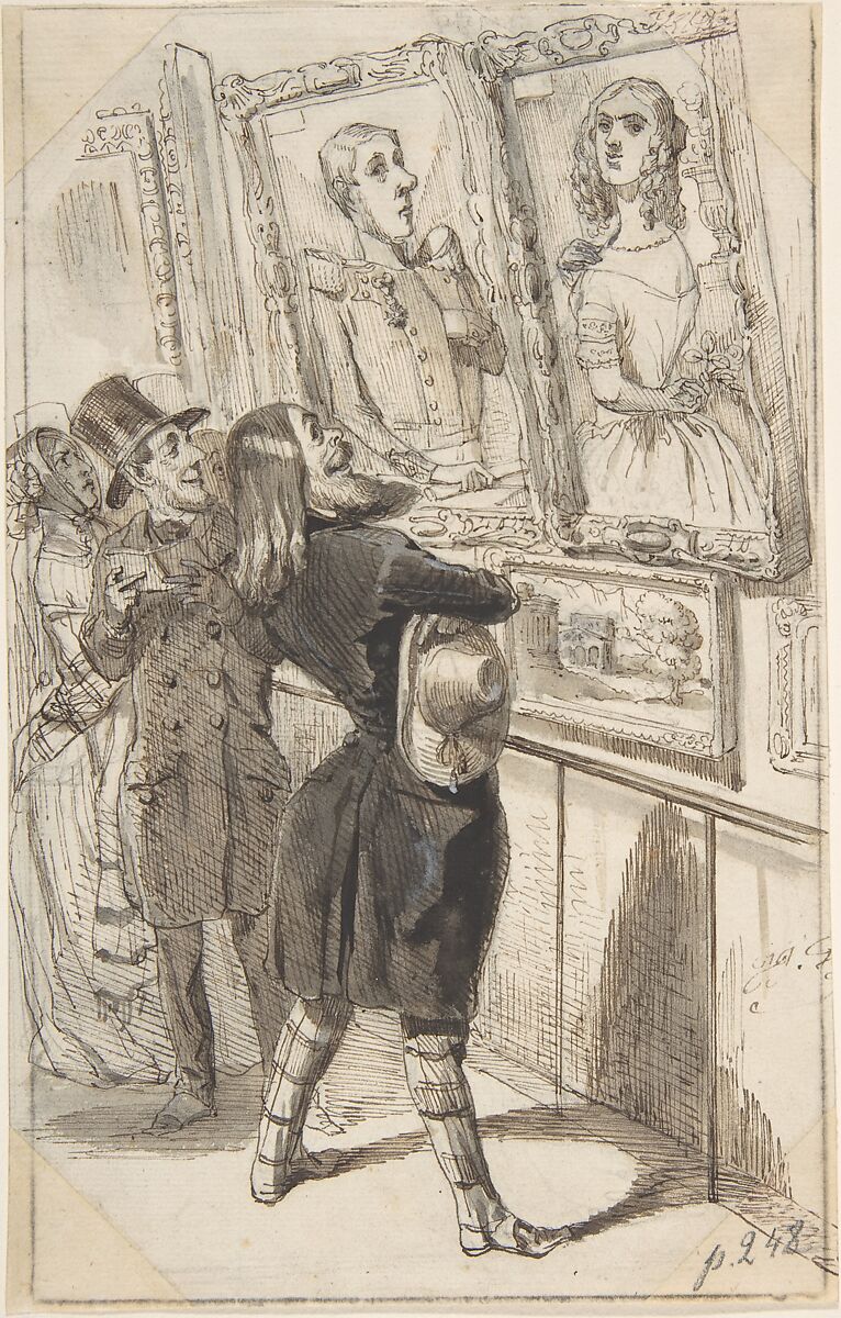 First published in 1842 without illustrations, Reybaud's social satire Jérôme Paturot à la recherche d'une position sociale recounts the attempts by the protagonist Paturot and his wife, Malvina, to improve their social standing by engaging in a succession of diverse jobs and artistic pursuits. Grandville, among the most prolific caricaturists and book illustrators of his day, was commissioned to produce illustrations for the 1846 edition. His drawn designs were reproduced in wood engravings for the book. In the chapter in which this illustration appears, Paturot has become a patron of the arts, advised by a painter named Oscar. The long-haired and bearded Oscar (in the book, flowing locks and full beard are signs of a true artist) convinces the couple to let him paint their portraits to be exhibited at the annual Salon. Once in front of his works "multiplying the gestures of a man transported by admiration. 'God! how like Rubens,' he said to himself - 'What flesh à la Veronese!'" Grandville was not convinced at first that he wanted to take on this commission because he found the novel dated when it originally appeared, but this many spirited designs only enhance the popularity of the enormously successful publication.