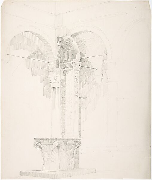 - Title: Romanesque Font, Arcade, and Lion on a Pillar, in a French Church