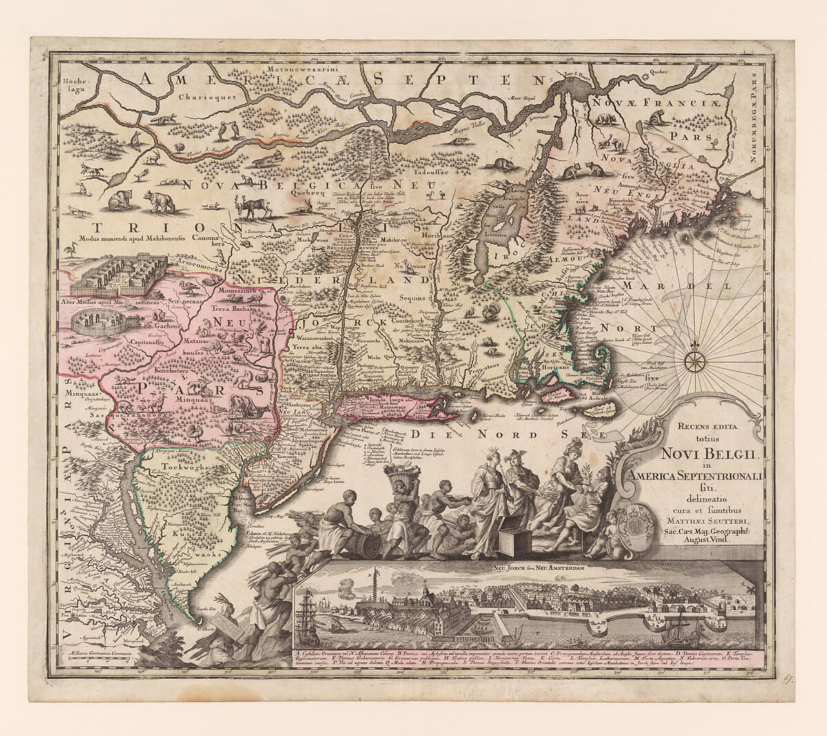 The Augsburg mapmaker Seutter based this rendering of America’s eastern seaboard on seventeenth-century precedents. A vignette view of Manhattan reproduces one created in 1654 to mark Holland’s brief repossession of the city. By 1730, Britain was in control, indicated here by George II seated below to receive Hermes, Athena, and Hera (symbolizing commerce, wisdom, and wealth), followed by dark-skinned figures carrying raw materials—an allegorized celebration of colonization that ignores the suffering endured by native and enslaved peoples. On the map, Native American place names predominate, with turkeys, moose, bears, and beavers used to indicate wilderness areas. Geographical inaccuracies abound and include the placement of the Meer de Irocoisen (Lake Champlain) east of the Versche (Connecticut) River.