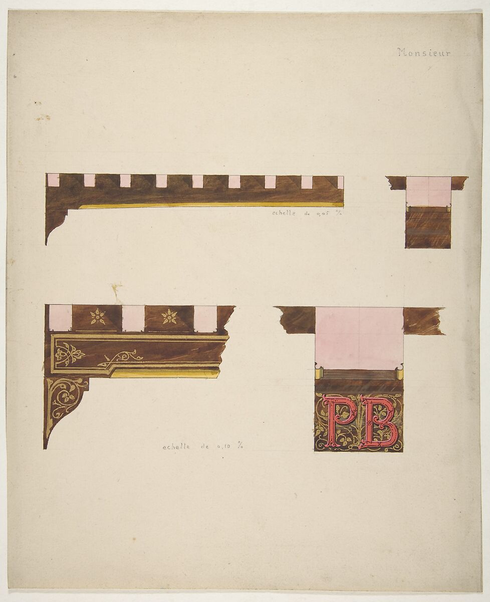 - Title:Designs for the painted decoration of ceiling timbers monogrammed "PB"