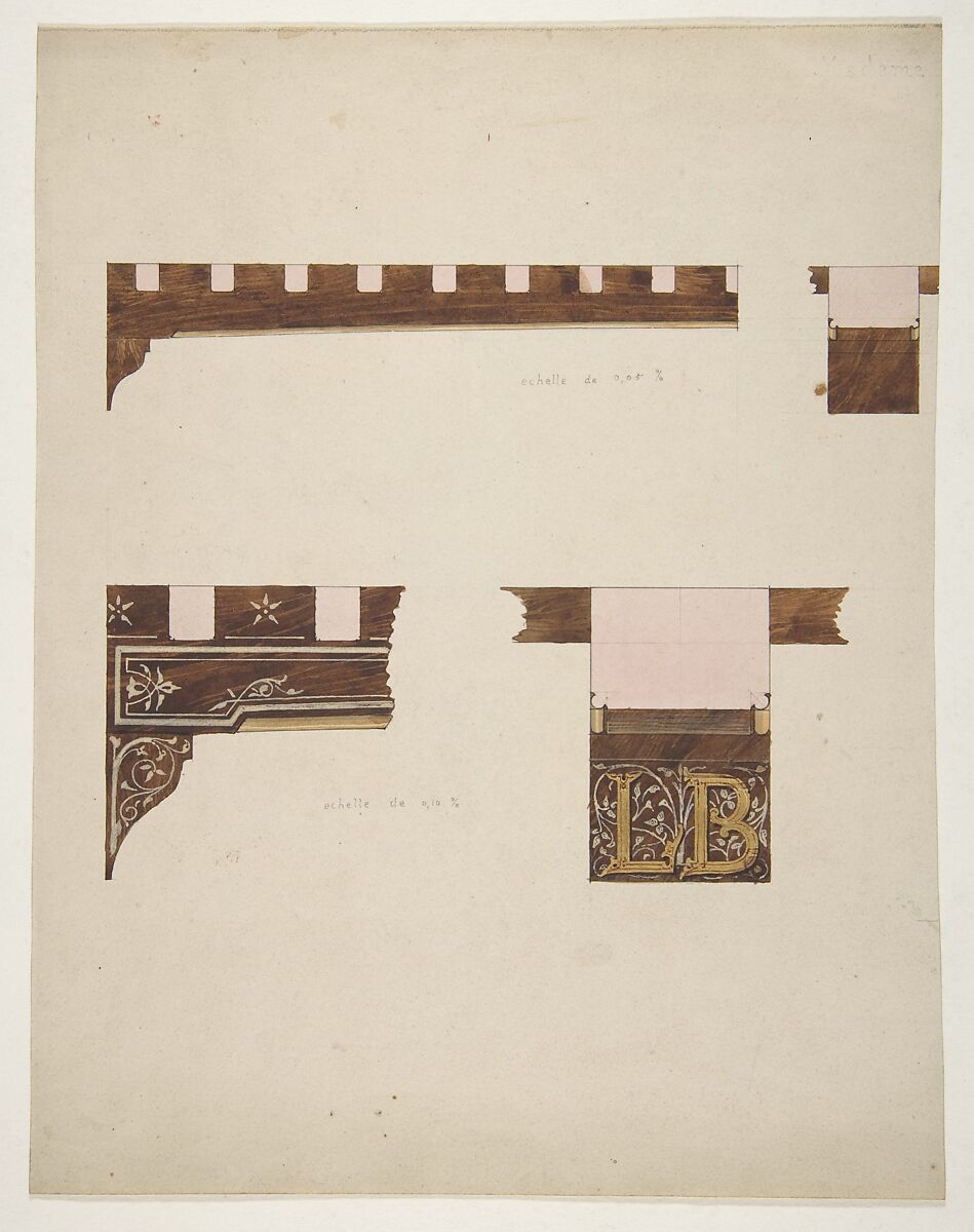 - Title:Designs for the painted decoration of ceiling timbers; one monogrammed: "LB"