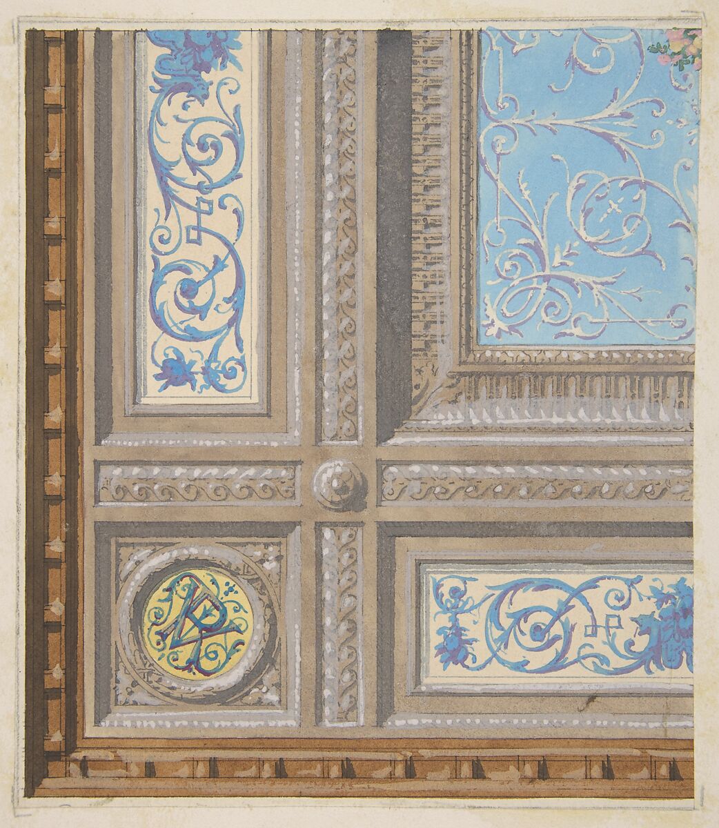 - Title:Design for the painted decoration of a coffered ceiling with initials: VR