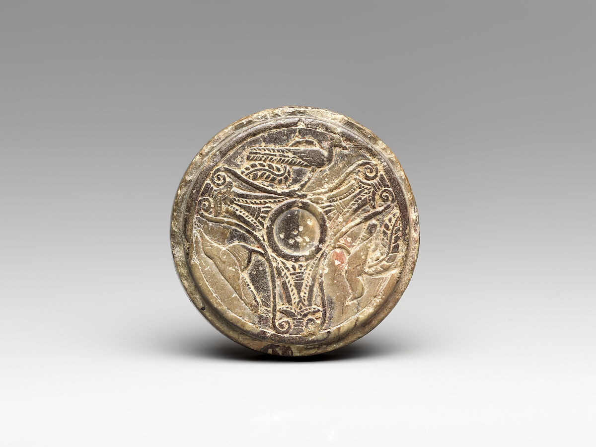 Recent finds of gold foil alongside finely carved discs suggest ring and disc stones were jewelers’ molds. Their designs incorporate honeysuckle and lotus, signs of auspiciousness and abundance. The Hellenized honeysuckle, introduced to India from Persia, had a popular local equivalent, the snake flower (nagapuspa).