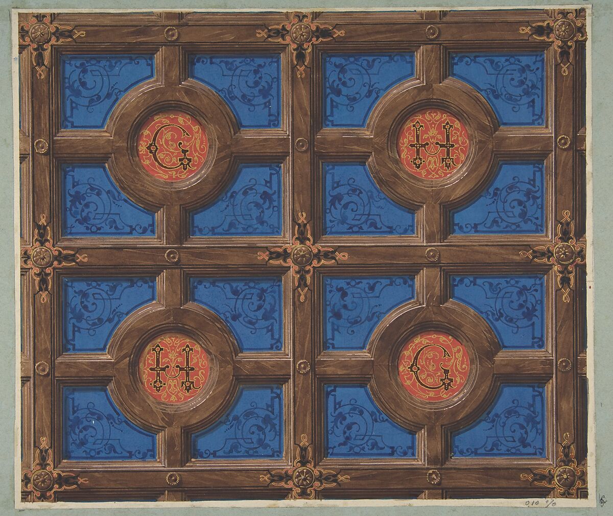 - Title:Design for the painted decoration of a coffered ceiling incorporating initials (G and H) for a house on the rue de Clichy
