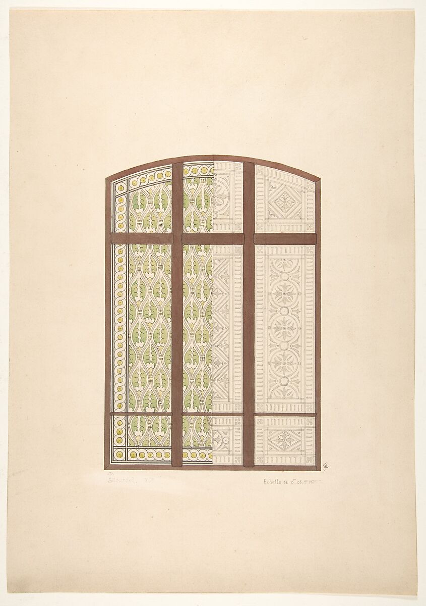 - Title:Design for an arched stained glass window, showing two alternative patterns