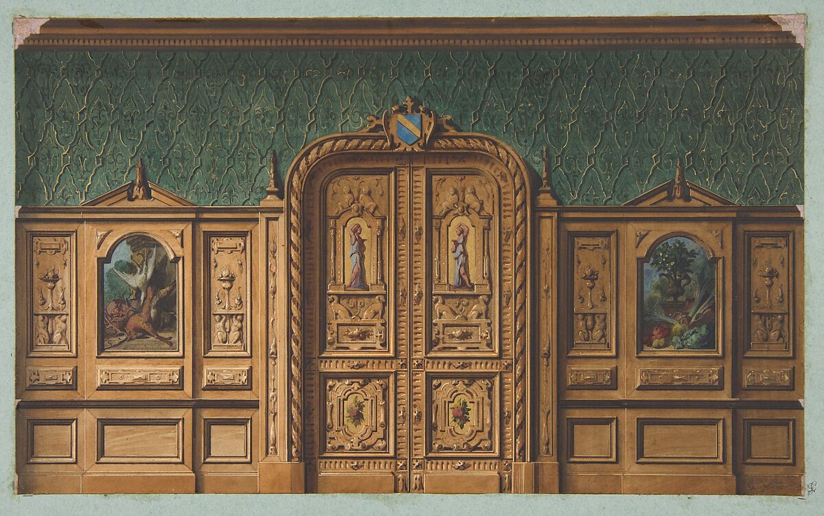 - Title:Design for a room with wood panels inset with paintings and a heavily-carved double door