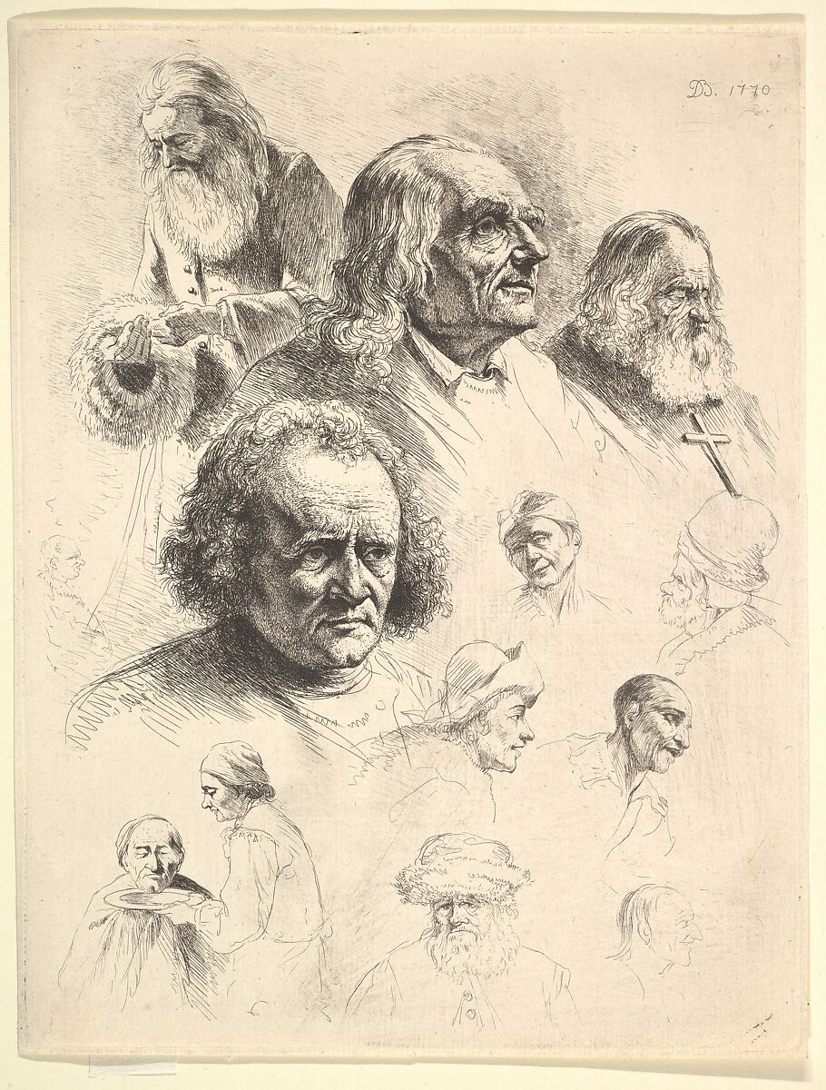Boissieu's graphic oeuvre includes several sketch plates such as this one, where an etching needle was used to draw independent sketches directly onto a prepared copper plate. A format originally associated with the learning process and an artist's initial forays into the medium, the sketch plate became, in the hands of Rembrandt and his eighteenth-century emulators, a vehicle for virtuosity. Here, Boissieu covered the plate with sketches, mostly of old men, juxtaposing heads drawn to different scales and with different degrees of finish.