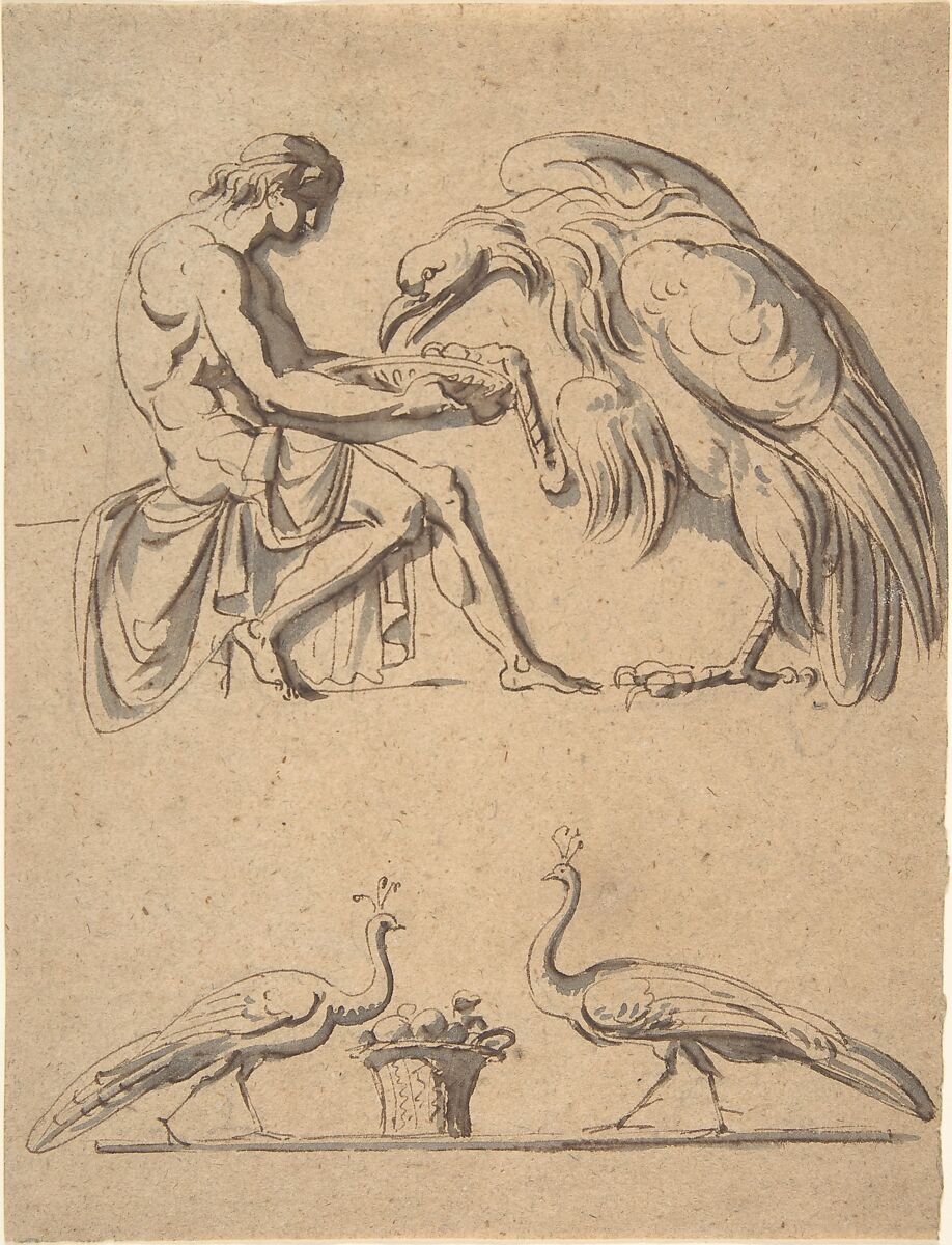 Jupiter, disguised as an eagle, with Ganymede, and a sketch of two peacocks