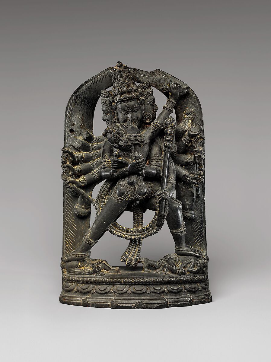 A popular Vajrayana deity in eastern India, Chakrasamvara here holds a range of weapons and stands in a sexual embrace with his consort Vajravarahi atop two demons. The Chakrasamvara Tantra text emerged in the eighth or ninth century and clearly links to the quasi-heretical Kapalika sect’s esoteric conceptions of the Hindu god Shiva. Small sculptures like this one freely moved across north India and Bangladesh, making their way to Tibet, giving these refined representations outsized importance.