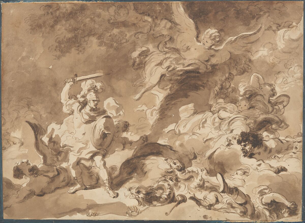 This boldly handled and beautifully preserved drawing by Fragonard illustrates a scene from canto 18 of Torquato Tasso's epic poem Jerusalem Delivered, published in 1581. The poem was a highly fictionalized and fantastic account of the First Crusade in 1099. In this scene, Rinaldo, a Christian knight on his way to the Holy Land, is detained by the pagan enchantress Armida until two of his fellow knights break the spell. Fragonard's drawing imagines the decisive moment of Rinaldo's victory, as he brandishes his sword overhead in the act of chopping down Armida's massive myrtle tree, thereby dispelling its enchantments.