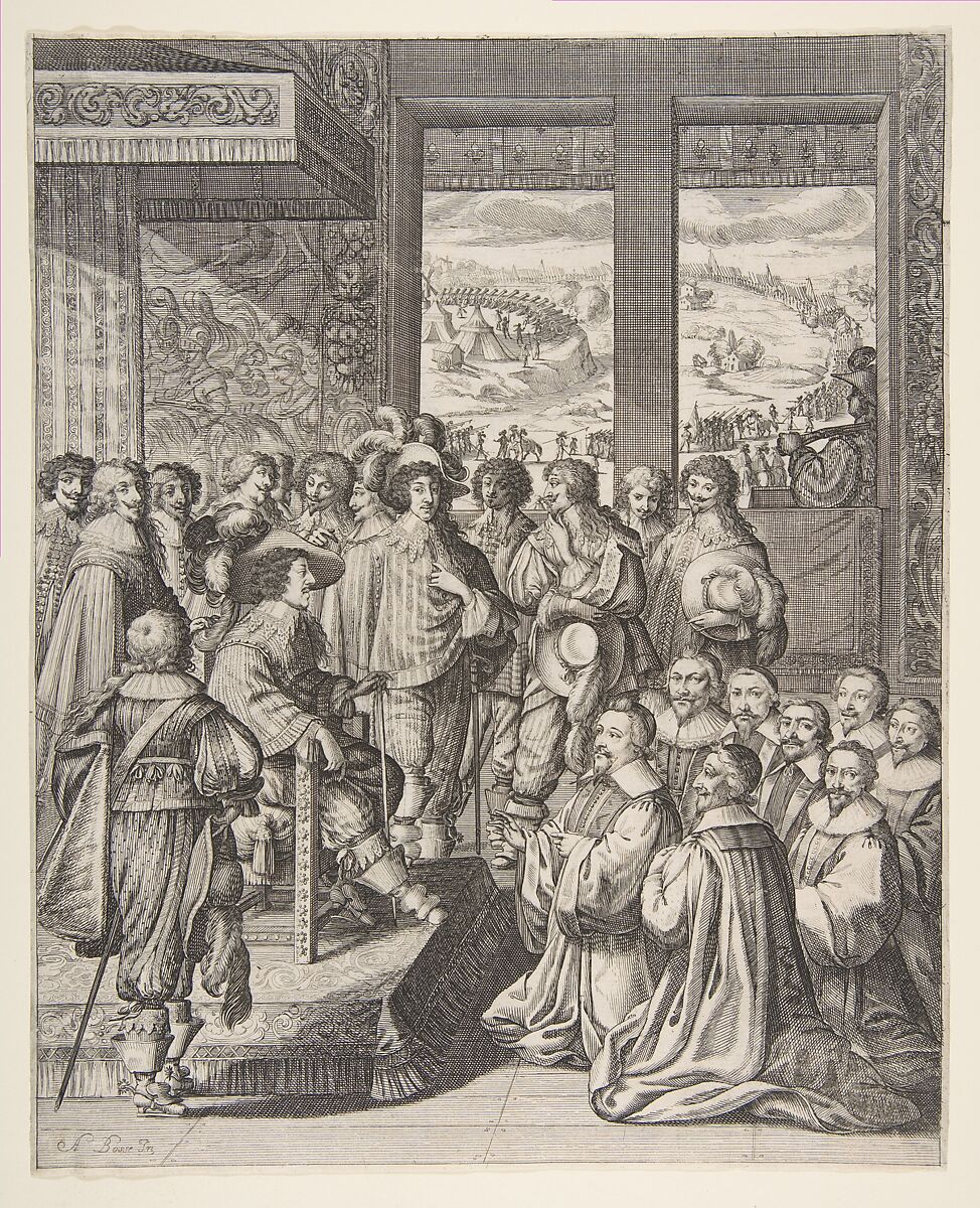 This plate was the frontispiece for a publication celebrating the triumphant return to Paris of King Louis XIII following the Siege of La Rochelle. In this formally constructed scene, the king is shown seated in a chair while Christophe Sanguin, the provost