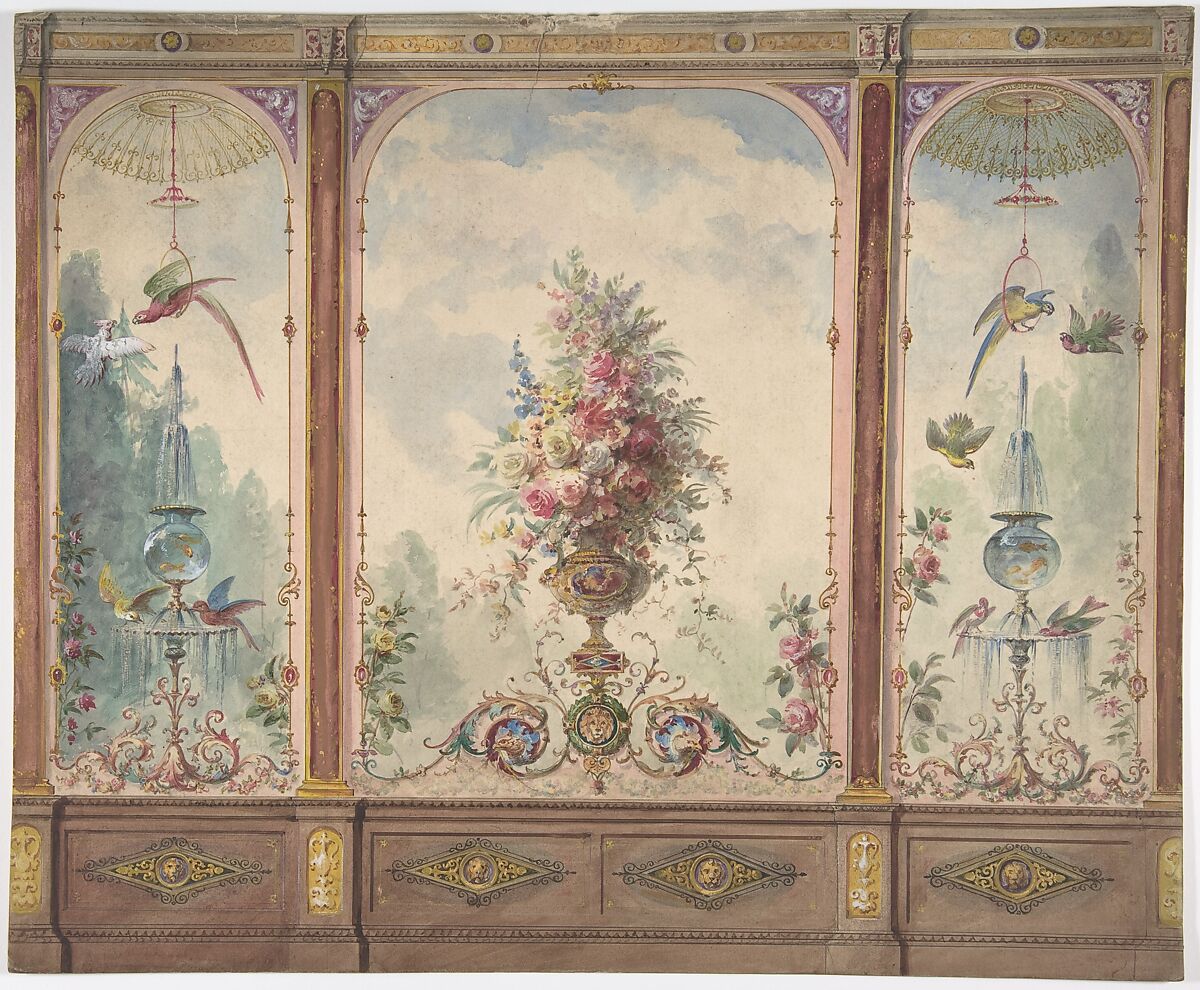 - Title:Design for a Wall with a Flower Vase, Birds, Two Gold Fish and Globe Fountains