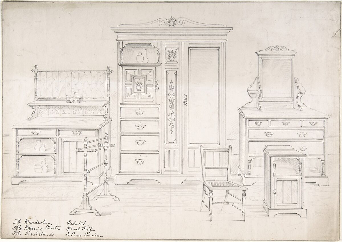 - Title:Designs for a Wardrobe, Dressing Chest, Wash Stand, Pedestal, Towel Rail and Cane Chairs
