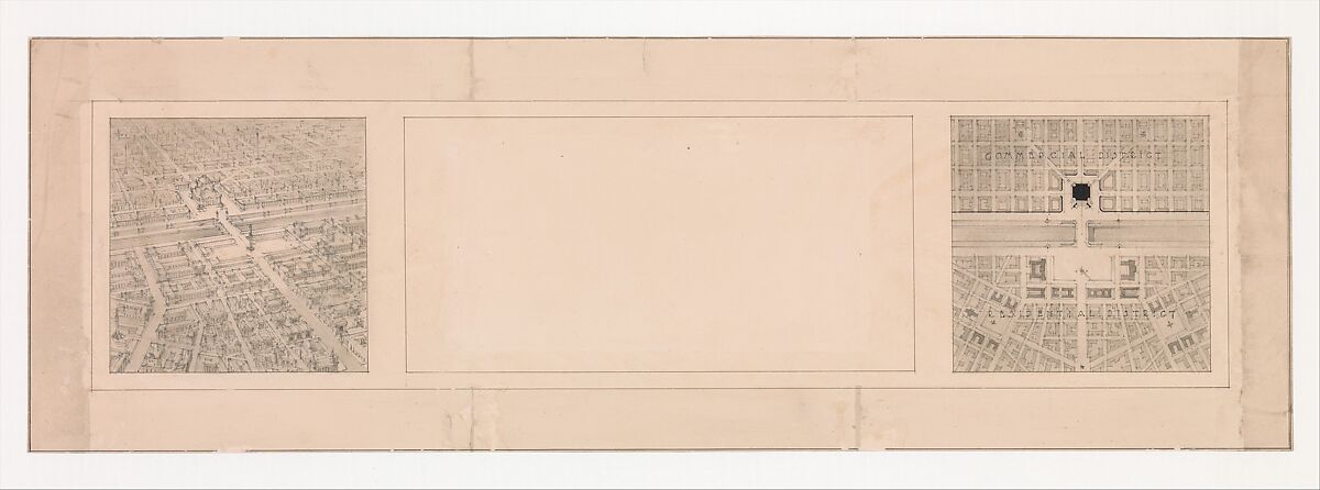 This drawing includes a three dimensional rendering of a city at left and related plan at right. The commercial district appears above, the residential district below with the zones separated by train tracks that are crossed by a bridge.