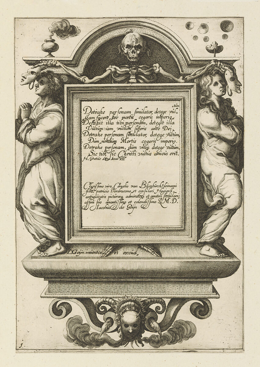 Title plate to the Masquerades series with an architectural, tabernacle-shaped frame. In the center is a rectangular panel with inscriptions. Behind it the figure of Death is portrayed. He holds two masks in front of the faces of a man and woman who are flanking the central text panel.