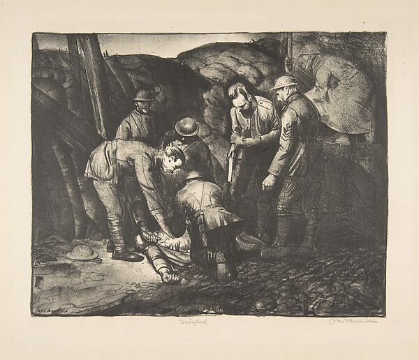 Sniped is a poignant image of soldiers in a trench encircling a fallen comrade. Bellows does not reveal whether the man has been wounded or killed by the unseen sniper, focusing instead on the group of soldiers and the omnipresent sense of death. The constant threat of danger is reinforced by the faint image of the soldier poised with his gun on the upper right, separated from the others by position and tone. Although he tried to enlist, Bellows did not see combat in Europe; his images are based on newspaper accounts and other published reports, photographs, illustrations, and soldiers’ stories. Sniped was published in the July 13, 1918, issue of Collier’s with a story on combat entitled "Something" by Donal Hamilton Haines.