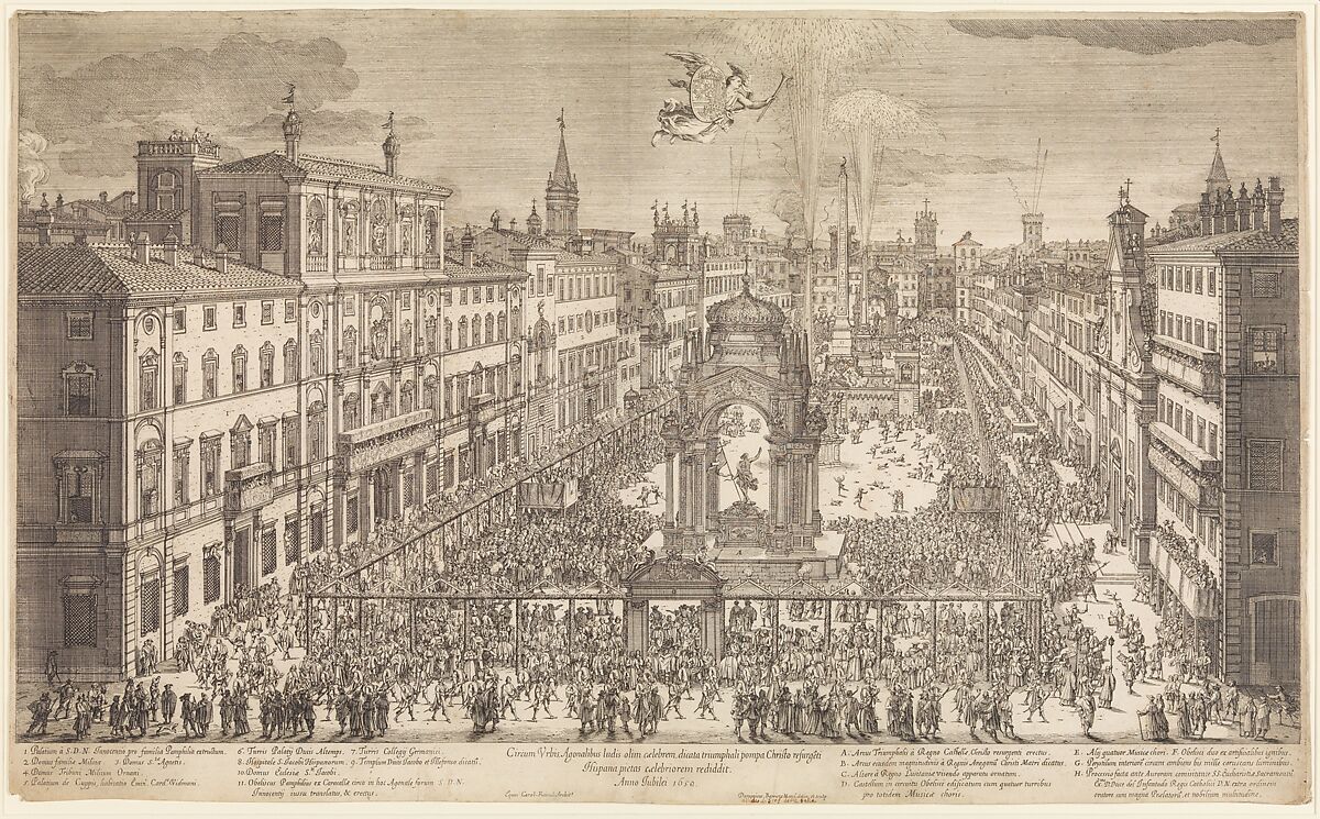 View of the Feast of the Resurrection in Piazza Navona, Rome, during the Jubilee year of 1650. The print shows the Piazza from the south. The celebration and the ephemeral architecture were sponsored by the Spanish community in Rome. The arches and colonnade shown in the print were designed by Carlo Rainaldi (1611-91) who also organized the celebrations. Fireworks are issuing from the structures that enclosed the two fountains in the square and many people parade within and around the perimeter. Numbers and letters along the bottom margin identify the permanent buildings and temporary structures.