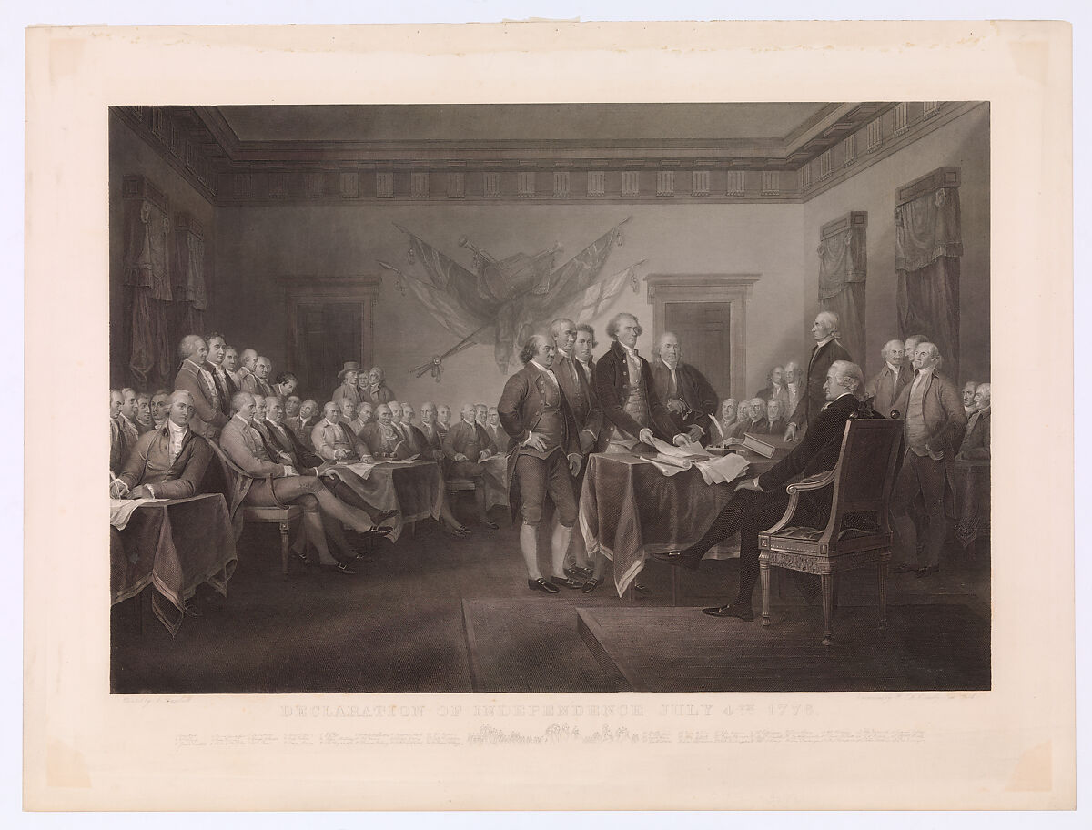 Though restrained in feeling, this print describes a profound revolutionary moment. It affirms the right of the original thirteen American colonies to separate from Great Britain—an unprecedented challenge to royal authority. The title is slightly misleading since what we actually witness is the drafters of the Declaration of Independence—John Adams, Roger Sherman, Robert R. Livingston, Thomas Jefferson, and Benjamin Franklin—presenting the text to the Second Continental Congress at Philadelphia on June 28, 1776, six days before ratification. Forty-two of the eventual sixty-two signers appear here portrayed from life. Based on Trumbull’s famous painting of 1786, the print was engraved to mark the centenary of the United States.