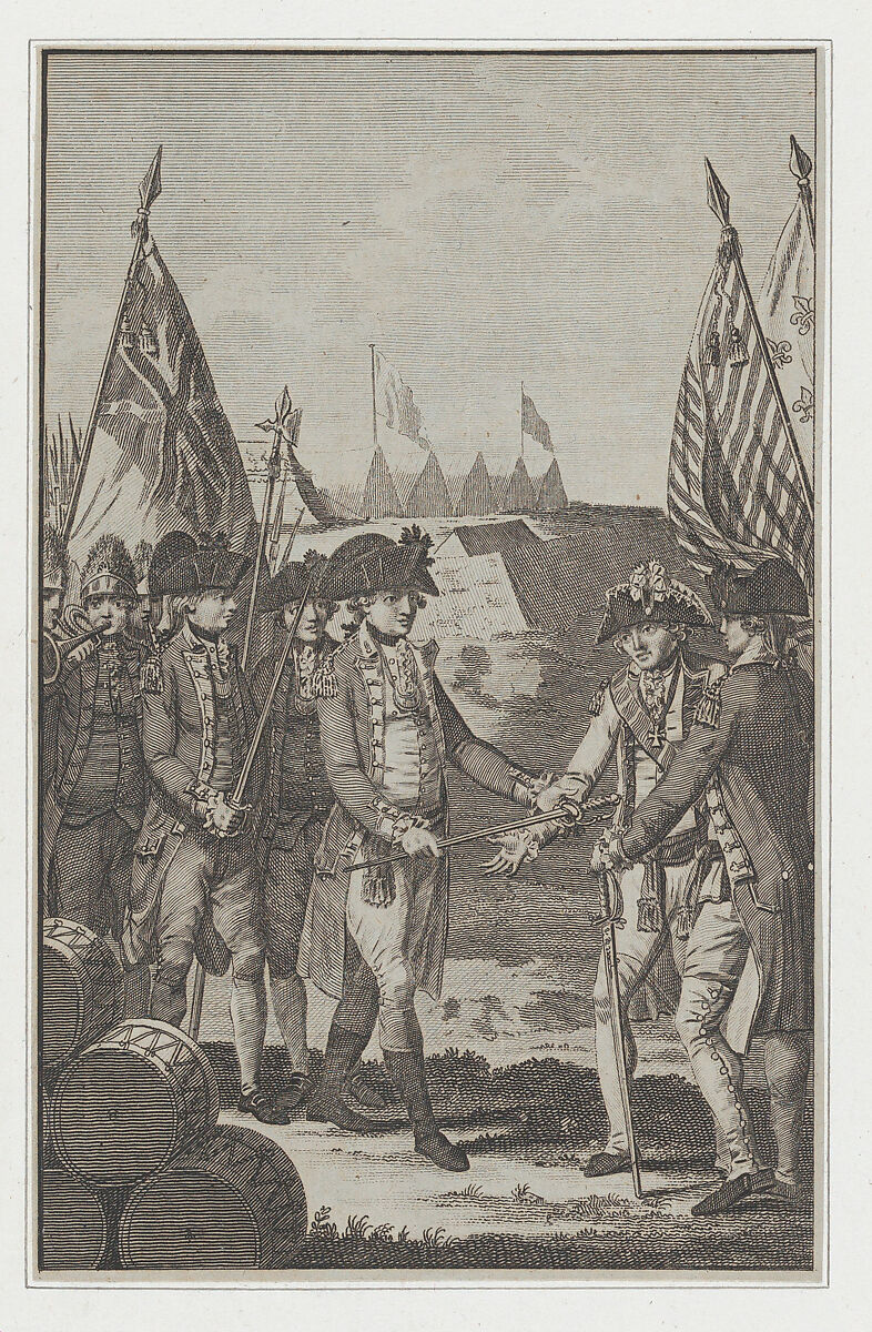 A group of British soldiers stand at left with an officer delivering a sword to American and French officers at right. Despite the print's title, the British commander Cornwallis pleaded illness and did not attend this ceremony, but send General O'Hara to act as his second. O'Hara initially attempted to surrender to the French general Rochambeau, who deferred to George Washington. Because Cornwallis has sent a second, Washington also declined and directed his own second, Benjamin Lincoln, to accept the sword. A British flag appears here at left and American and French flags at right, with army tents behind. The print was published to illustrate Edward Barnard's, "New, Complete & Authentic," or "New, Comprehensive and Complete History of England from the earliest period..., London 1781–83.