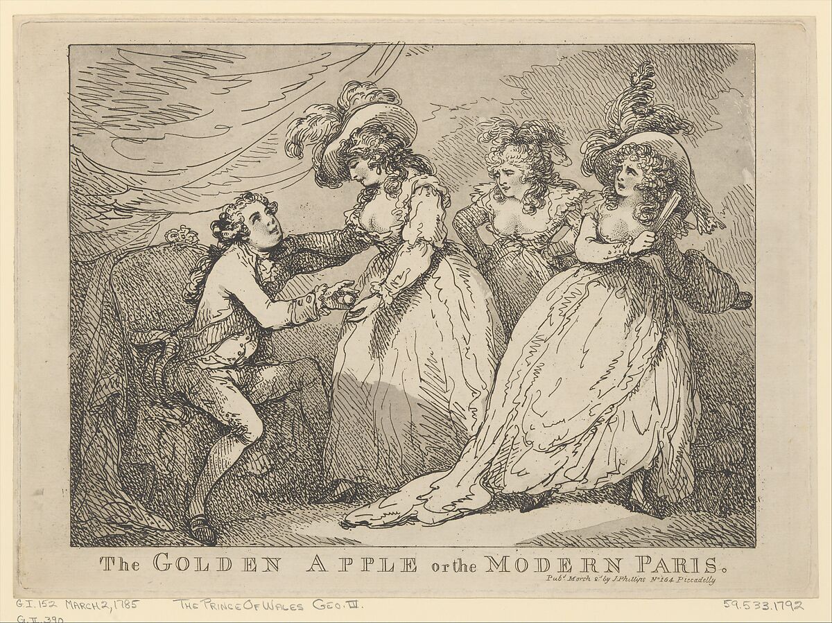 Echoing the myth where Paris picks one of three goddesses to receive a golden apple, the Prince of Wales here decides between the attractions of the Duchesses of Rutland, Devonshire, and Gordon.