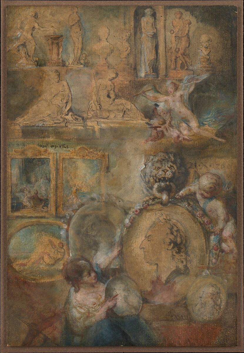 Ironically, it was Gabriel de Saint-Aubin, whose aspirations to become a member of the Académie Royale were never realized, who provided posterity with visual records of the biennial Salons held in the Palais du Louvre to showcase new work by its members. His drawings of the Salons ranged from fully realized views of the exhibitions with visitors to thumbnail sketches of individual works made in the margins of the accompanying brochures. This work is a hybrid, in which sketches of paintings and sculptures on view in the Salon of 1769 were initially drawn in chalk in bands across the sheet, then later worked up in oil paint, and finally embellished with allegorical figures of the arts descending upon clouds to honor King Louis XV as a great patron, presenting his portrait to the viewer.