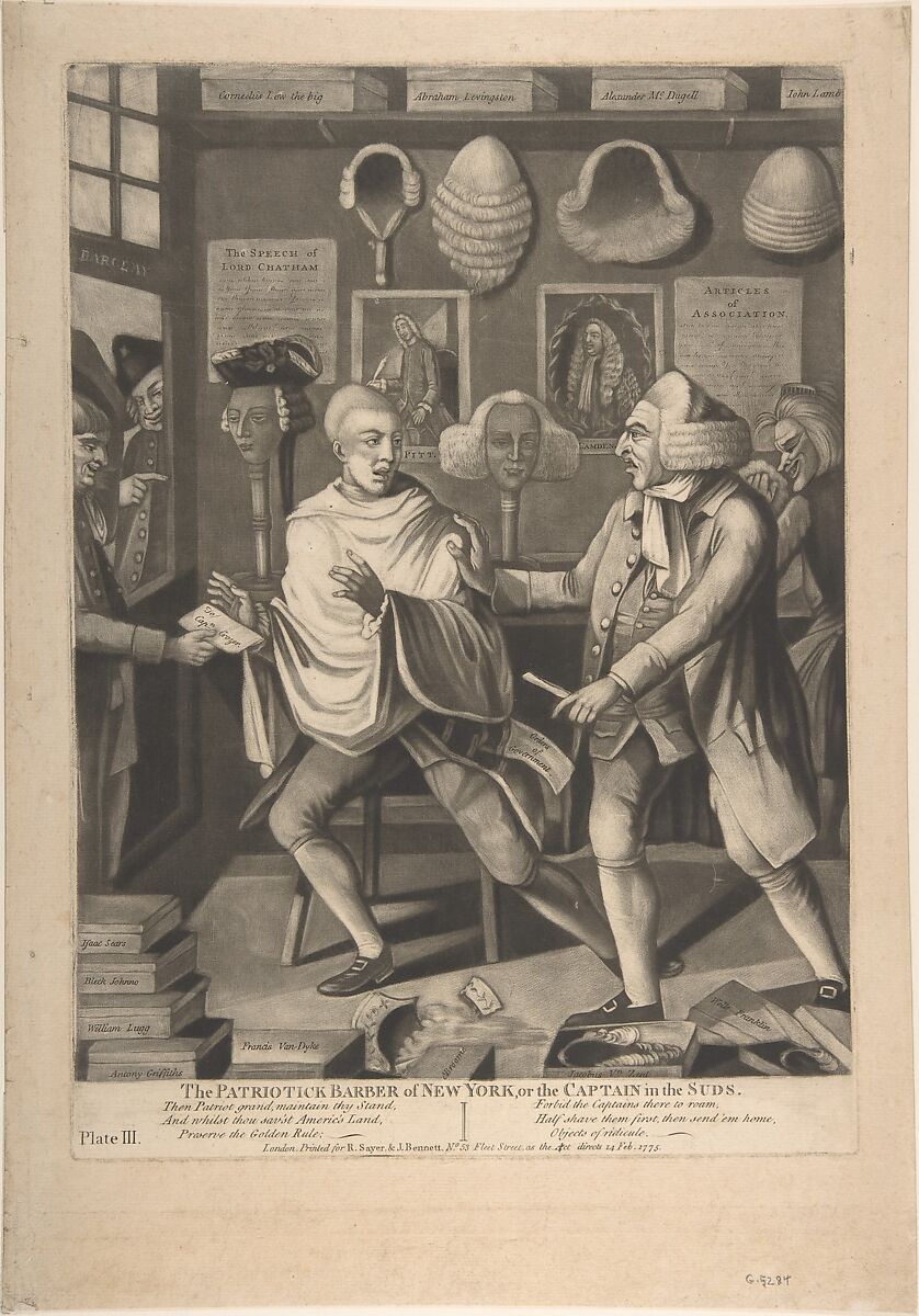 In this satire, issued in London the year before the outbreak of the American Revolution, Captain John Crozer, commander of a British ship, has been recognized in the barbershop of Jacob Vredenburgh, a New York Son of Liberty who refuses to finish shaving him. The subject demonstrates how New Yorkers refused to cooperate with British troops garrisoned in the city from the autumn of 1774. When the story reached England it inspired this print. The following verse is printed below the image: "Then Patriot grand, maintain thy Stand,/ And whilst thou sav'st Americ's Land,/ Preserve the Golden Rule;--/ Forbid the Captains there to roam,/ Half shave them first; then send 'em home,/ Objects of ridicule." Some of the figures are caricatured, others represented more realistically. The names of Sons of Liberty are inscribed on wig boxes throughout the compostion. Famous defenders of civil liberties, William Pitt the Elder, 1st Earl of Chatham, and Charles, 1st Earl Camden are portrayed in prints that hang on the back wall.