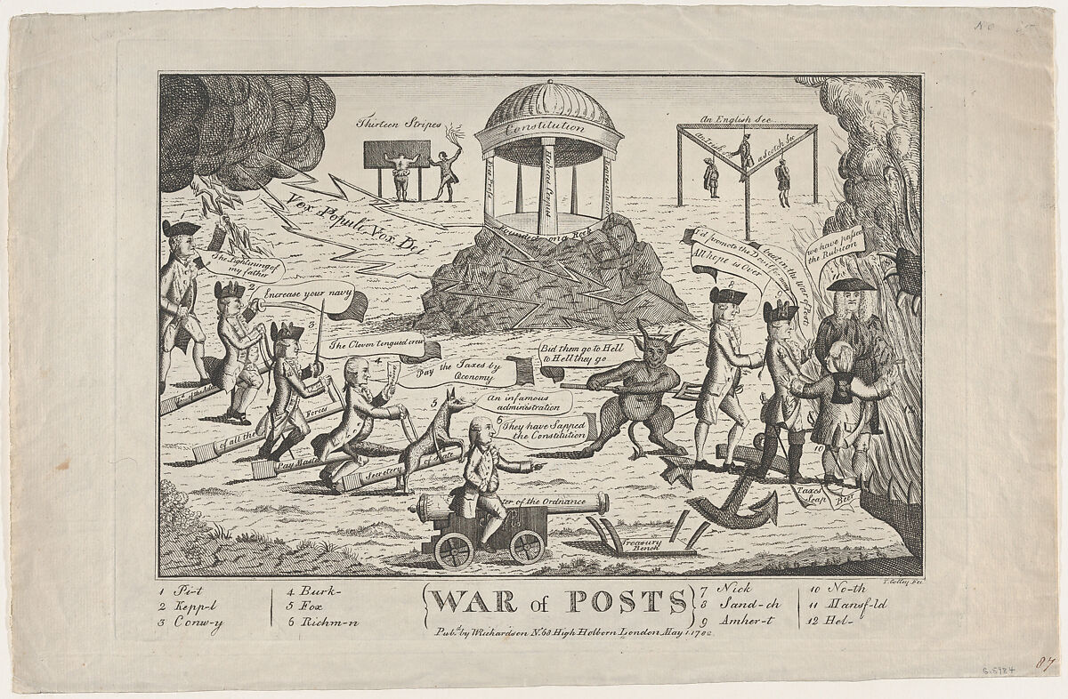 This satire relates to British political factions during the Revolutionary War, and shows Pitt, Keppel, Conway, Burke, Fox, Richmond at left, urging the Devil, at right, to push Sandwich, Amherst, North, Mansfield into the flames of Hell. Behind this drama, the constitution is symbolized by a domed building, with a man in the stocks being given thirteen lashes (a reference to the American colonies), and three figures on a gibbet identified as "an English secretary" (i.e. minister) "an Irish secretary" and "a Scotch secretary."