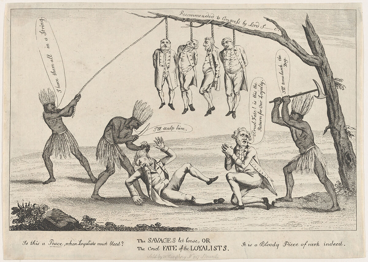 This satire reflects the dissatisfaction of British loyalists at the end of the American Revolution. Military and civilian men are shown being murdered and strung up as trophies by Native peoples whose feathered headdresses and kilts echo traditional allegorical representations of America. The revengeful figures likely refer to the victorious Americans who, after winning the war in 1781, often confiscated the property of loyalists and also imprisoned and even attacked them. After the Peace of Paris in 1783, many loyalists received financial compensation from the British government.