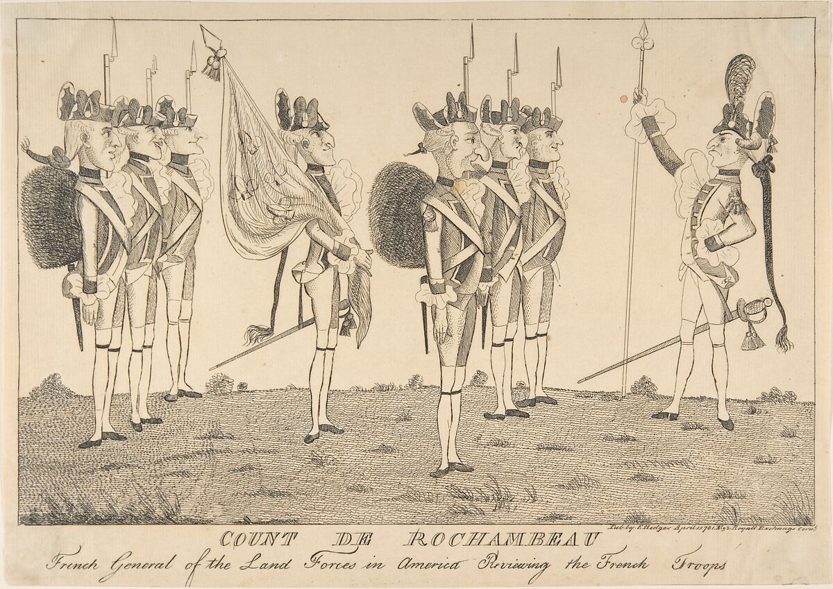 This image satirizes the French general and his army of 5,500 troops, a force that arrived off Rhode Island on July 11, 1780 (8,000 had been promised to aid the waiting Americans).