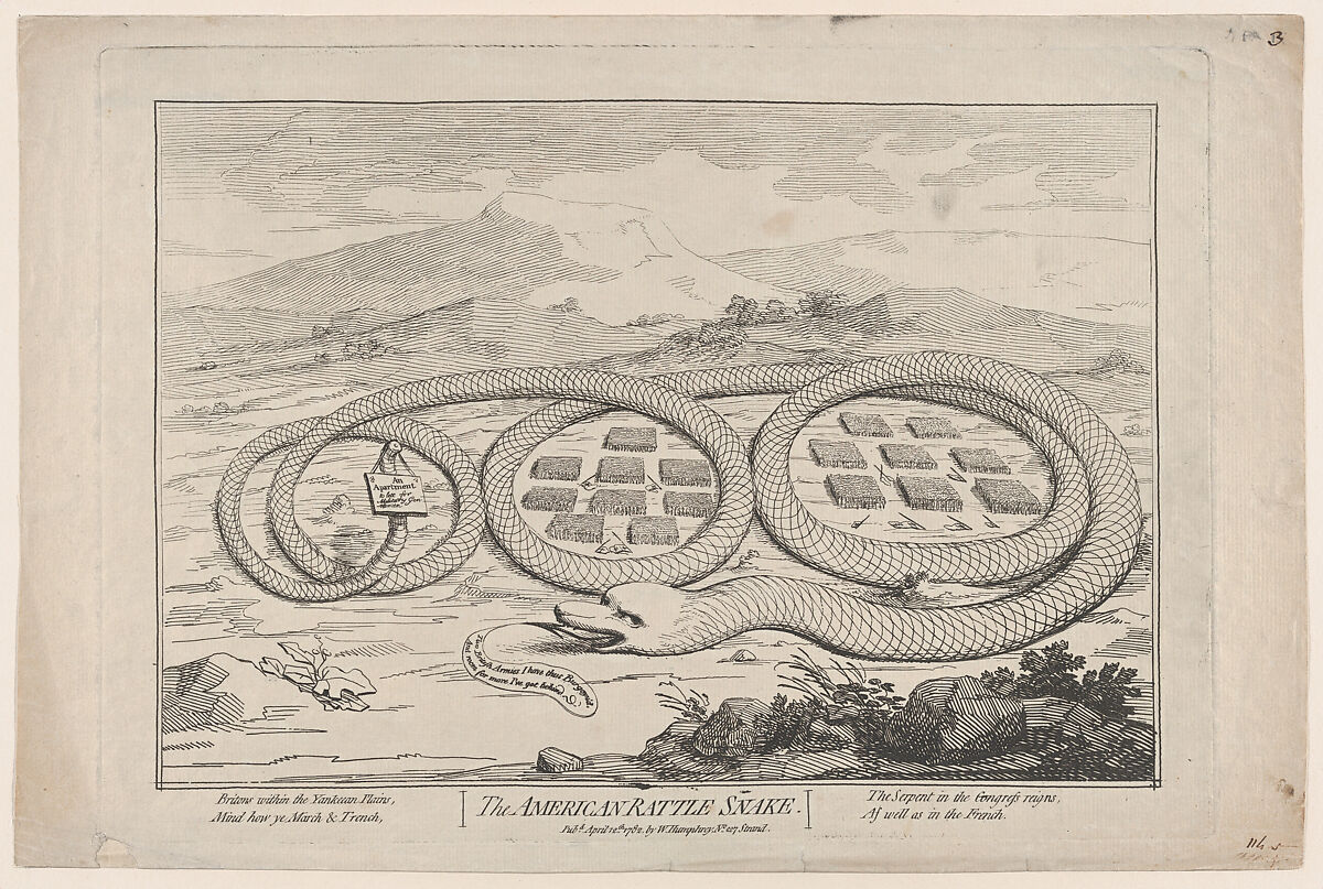 This satirical print, one of Gillray's earliest, centers on a snake–a popular American symbol before the emblematic stars and stripes were devised for the nation's flag. In 1754 Benjamin Franklin had famously designed a woodcut of a dismembered serpent for the Pennsylvania Gazette, accompanied by the legend "unite or die." After the first American congress of 1774, the New York Journal published an image of a living snake curled around a tree of Liberty, with text that stated "united now alive and free." Gillray's image responds to two American victories that helped to secure the outcome of the Revolutionary War. His text makes it clear that he is commenting on General John Burgoyne's surrender at Saratoga, New York on October 7, 1777 and General George Cornwallis's surrender at Yorktown, Virginia on October 19, 1781. The coils of the serpent have forced the troops under the command of these two generals to lay down their flags. Text below states "Two British Armies I have thus Burgoyn'd, And room for more I've got behind." A sign hanging from the reptile's tail reads "An Apartment to let for Military Gentlemen," to suggest that the two defeated generals must now be looking for new lodgings.