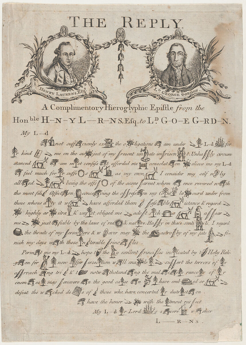 The Reply: A Complimentory [sic] Hieroglyphic Epistle from the Honorable Henry Laurens to Lord George Gordon