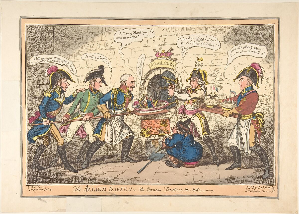A few days after this print appeared Napoleon abdicated his imperial crown. To convey this dramatic reversal of fortune, Humphrey and Cruikshank transformed a famous 1806 composition by Gillray (shown nearby). The bakers are now allied generals who prepare to consign the tiny figure of the fallen emperor to the flames (although Napoleon was not executed but exiled). Gebhardt von Blücher, who led Prussian troops to victory over the French at Leipzig in 1813, approaches the oven from the left, assisted by Russian and Swedish generals. At the right, the British Duke of Wellington, whose armies pushed the French out of Spain, brings pies containing trophies of those victories. The Austrian emperor Francis I pretends the oven door is stuck. As Napoleon’s father-in-law, he had urged armistice but did eventually join the allies to support abdication.