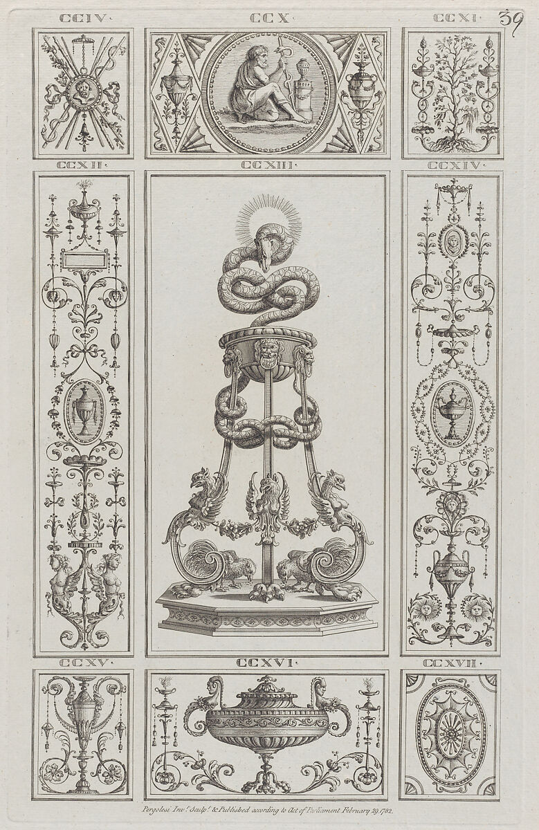 - Title: Tripod and Panels of Ornament, nos. CCIV–CCXVII, plate 39 from "Designs for Various Ornaments"