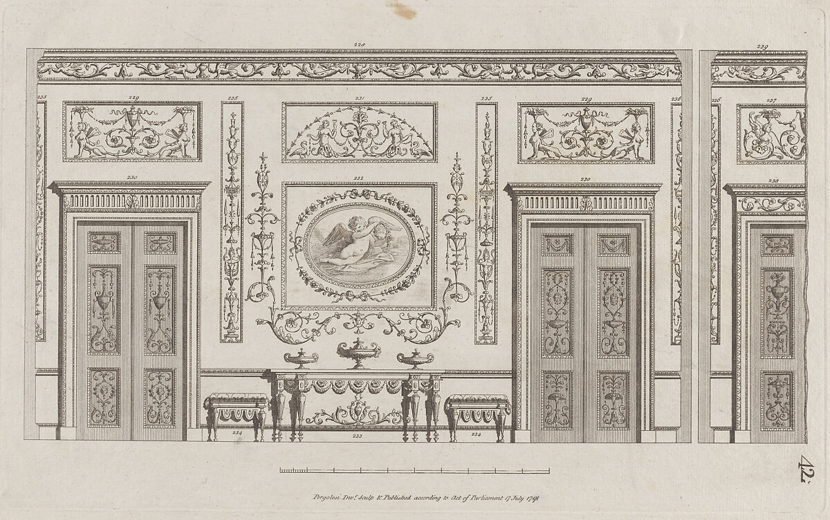These designs for an interior wall with doors, and a central panel showing Cupid holding a wreath, are numbered 228-239. The print comes from a group that Pergolesi made and published serially in London between 1777 and 1792. There is no title page, but a prospectus of ca. 1786 described the group as: "A great variety of original designs of vases, figures, medallions, friezes, pilasters, panels and other ornaments, in the Etruscan and grotesque style." The complete set contains 67 plates numbered 1-66 (two are numbered 56), with designs within the plates irregularly numbered 1-435 (in Roman numerals at first, then with Arabic numbers). In 1801, after Pergolesi's death, four additional plates of designs were published by a bookseller Dulouchamp (or Dulonchamp).