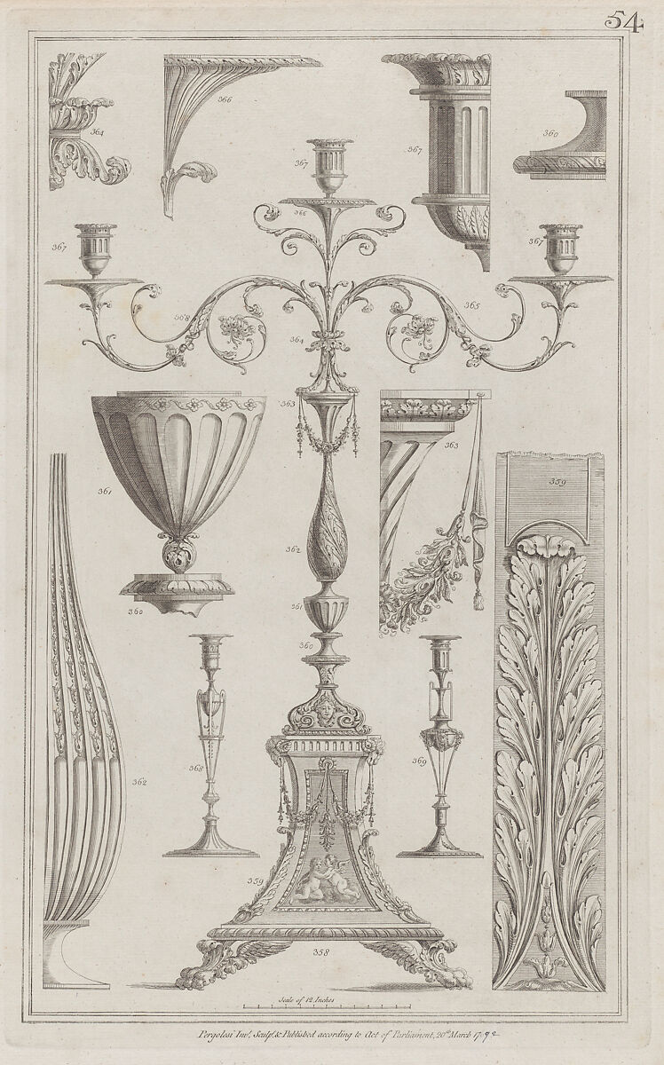 - Title: Candelabra, Vessels and Ornament, nos. 358–369, plate 54 from "Designs for Various Ornaments"