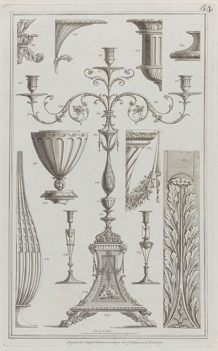- Title: Candelabra, Vessels and Ornament, nos. 358–369, plate 54 from "Designs for Various Ornaments"