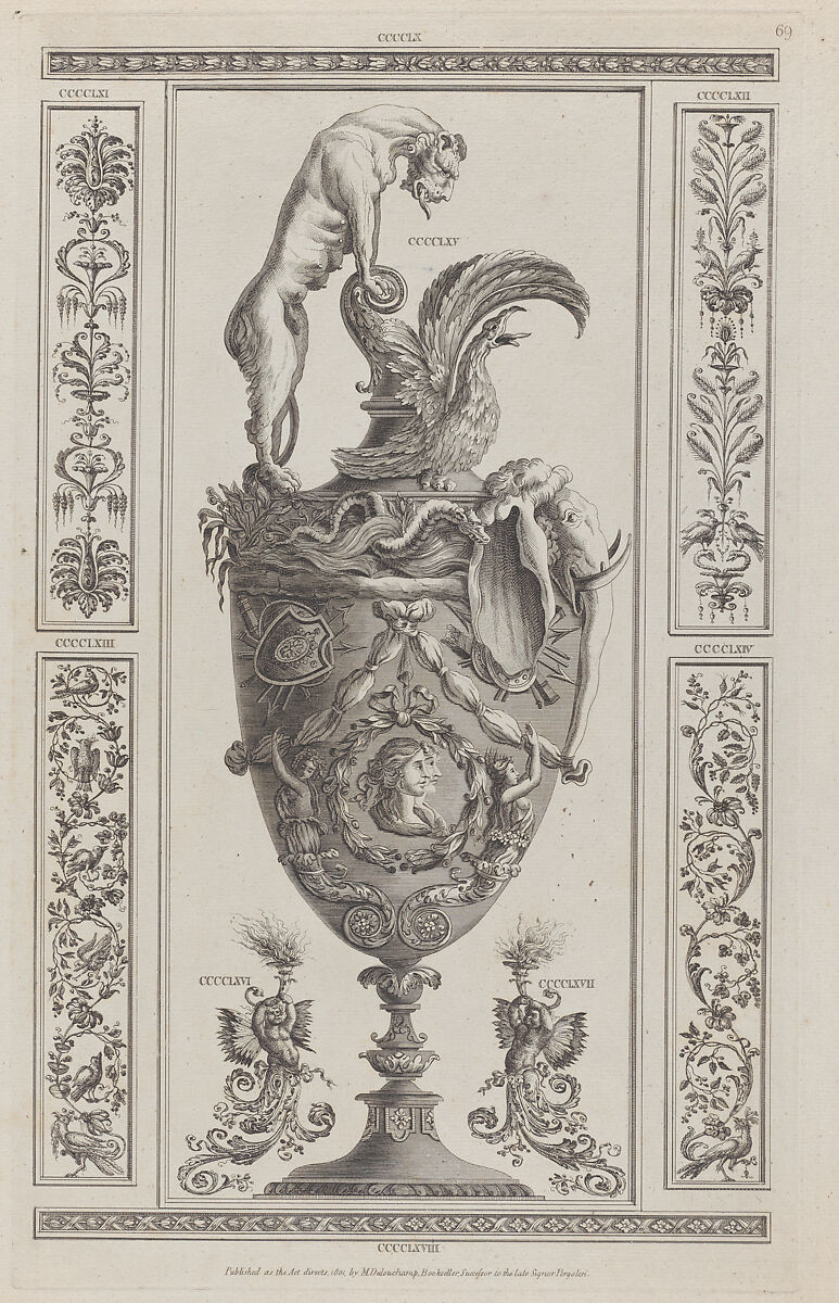 - Title: Vases and Ornament, nos. CCCCLX–CCCCLXVIII, plate 69 from "Designs for Various Ornaments"