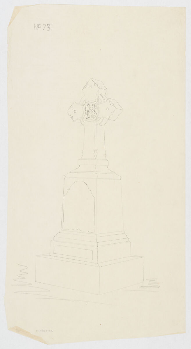 Alexander Maxwell designed and made grave monuments for New York area clients in the mid-nineteenth century (a fine example is a Butterfield family mausoleum of ca. 1875 at Woodlawn Cemetery in the Bronx). They likely were related to the marble and granite suppliers Alexander Maxwell & Co. of East Canaan, Connecticut, who provided marble for New York City Hall in 1838, and for a hundred columns used in an extension of the United States Capitol, Washington DC in 1860. This drawing comes from a group of designs for private memorials.
