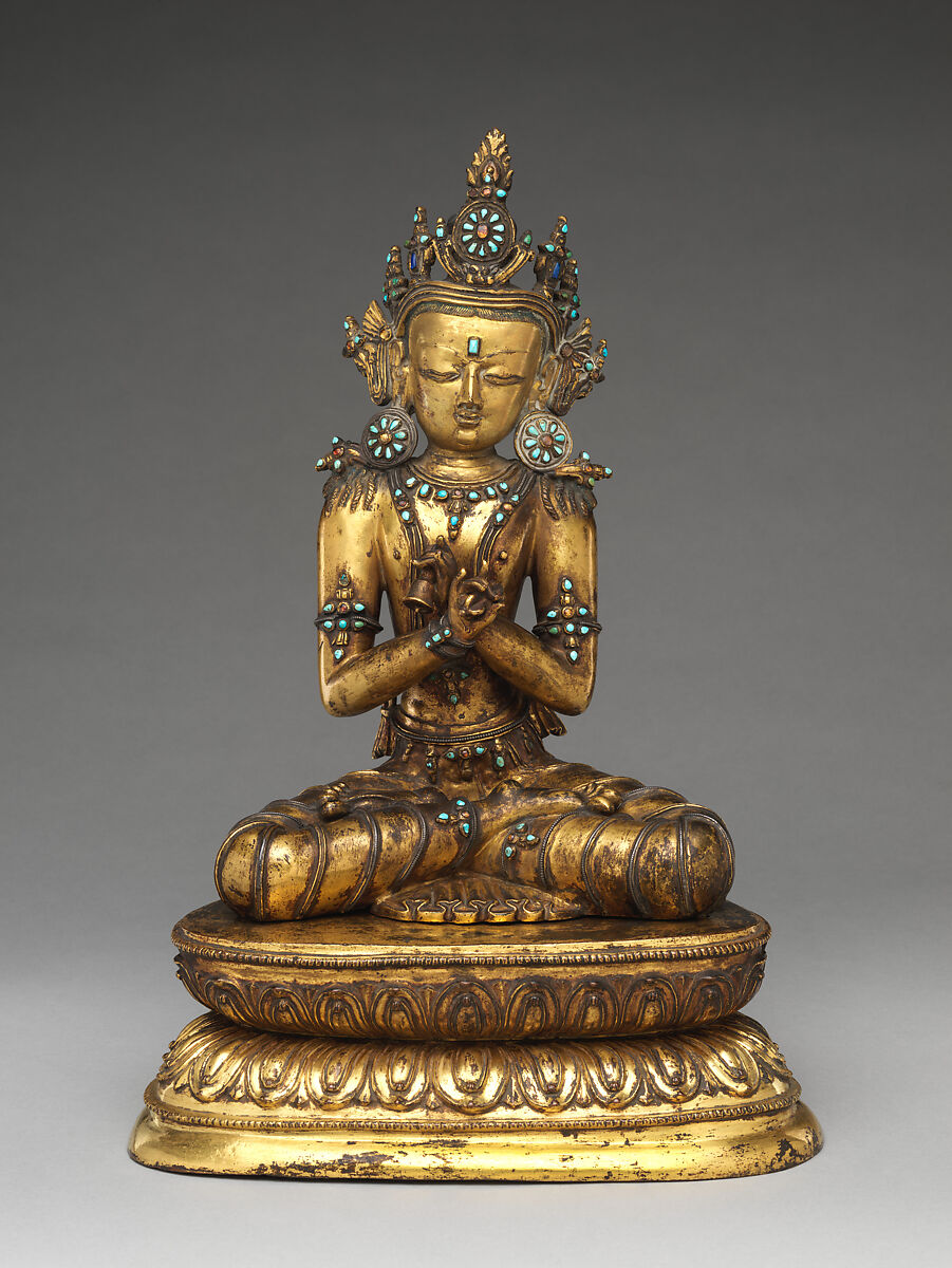 The Buddha Vajradhara is a divine manifestation of the totality of Buddhist teachings and is credited with being the source of the Buddhist tantric texts. Here, he holds a vajra and a bell that symbolizes energy (male) and emptiness (female). This sculpture is remarkable for the many surviving original inset pieces of turquoise and semiprecious stones and for the silver wire inlay in his dhoti (loincloth). These components indicate his divine status and evoke the crystalline nature of the heaven where he resides.