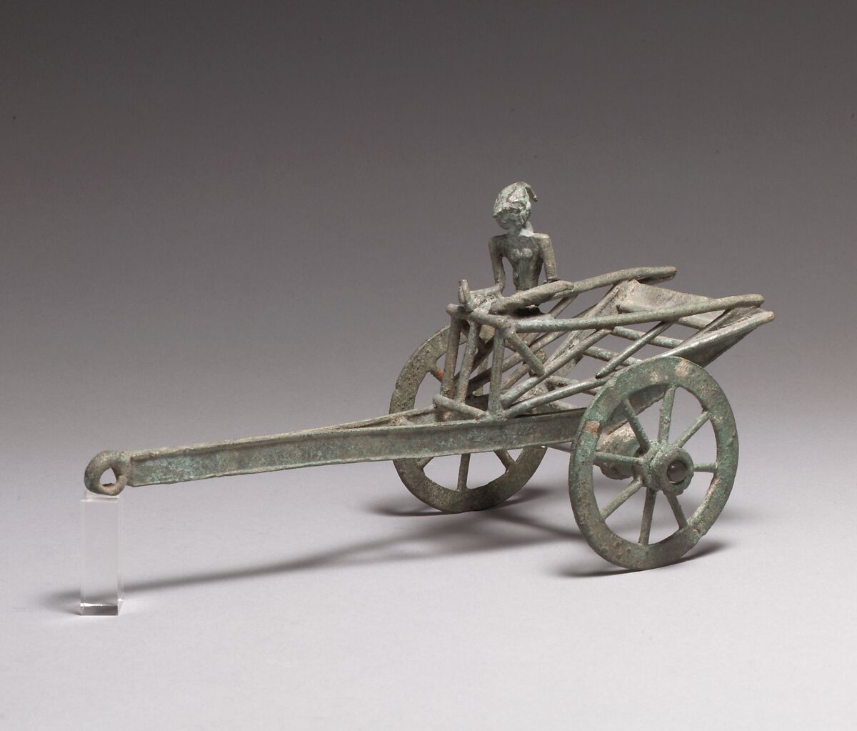 Bronze toys with wheels and axles from the Eastern Javanese period usually take the form of horses and riders or rams and other animals. Representations of carts and drivers are uncommon but probably once existed in some numbers. In this example, the cart, faithfully reproduced from some original, is carefully modeled, but the driver is represented in a curiously cursory fashion. His dress and hairstyle indicate his humble origins, and his cap (or pigtail) and long pointed nose give him the look of a character from the Javanese shadow-puppet world. The significance of the short object in his right hand and of the longer one held in his left and extending beyond his elbows is unclear. The charm of the object is as apparent to us today as it must have been to its original owner.