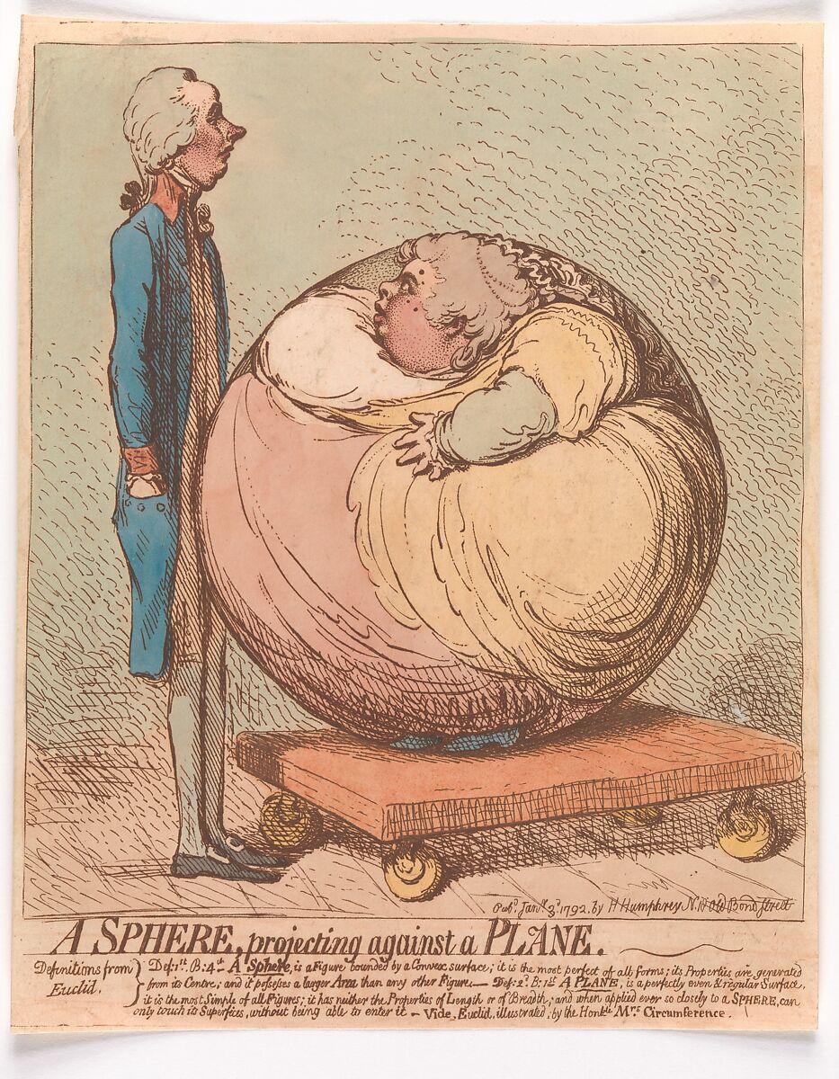 Gillray cast two well-known public figures as geometrical opposites in this potent image, a prime example of exaggeration and contrast as sources of visual humor. William Pitt, who twice served as Britain's head of government (1783–1801, 1804–6), was a tall, thin, frugal workaholic. The Honorable Albinia Hobart, later Countess of Buckinghamshire, was heavily obese, a gifted amateur thespian, an avid gambler, and an enthusiastic supporter of Pitt's chief political rival, Charles James Fox. Gillray often caricatured each of them, but he generally placed Pitt in political situations and Mrs. Hobart in social ones. Here, he brought them together in an abstracted space with physiques exaggerated to the point of absurdity. Pitt stands in profile to represent a plane, while Mrs. Hobart's contours have been dissolved to form a sphere. No longer able to walk, she must be conveyed on a trolley, since rolling would be indelicate. Gillray emphasized the mathematical foundation of the joke by placing a Euclidian definition below.