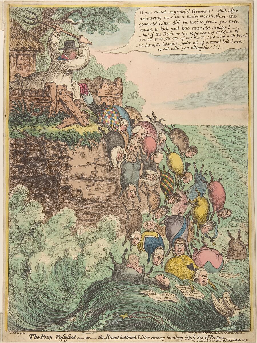 King George III appears as an angry farmer driving overfed pigs over a cliff. These pigs have the faces of Whig politicians and have weakened the nation by their greedy pursuit of government posts. Farmer George (the king’s nickname in real life) uses his foot to prod from office the playwright-politician Richard Brinsley Sheridan, who is clad as a Harlequin. The ousted chief minister, William Grenville, floats in the foreground wearing a yellow suit while resting one trotter on a bill for Catholic Emancipation, the defeat of which helped bring down his ministry. Gillray borrowed his imagery from the Gospel of Mark (5:1-20) where Jesus casts a legion of demons out of a possessed man and into a herd of swine, which then runs into the Sea of Galilee. King George is thus presented as the nation’s savior, and the defeated Whigs as devils.